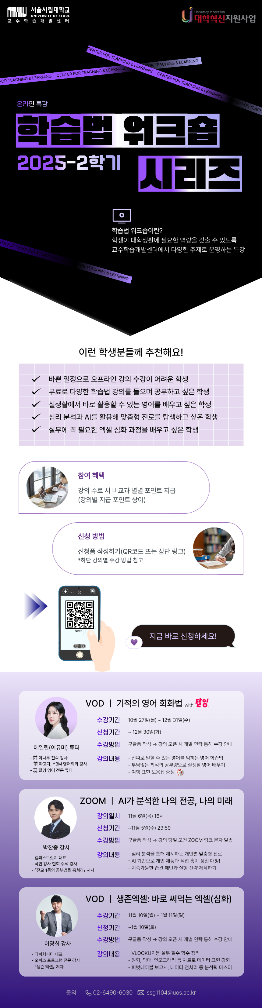 서울시립대학교 교수학습개발센터에서 진행하는 2025학년도 2학기 학습법 워크숍 시리즈 안내드립니다.