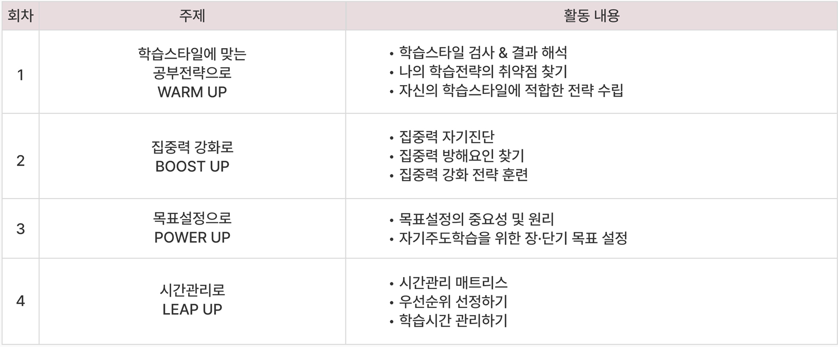 • ‘학습스타일, 집중력, 목표설정, 시간관리’ 총 4가지 ‘학습법 워크숍’ 온라인 강의 제공